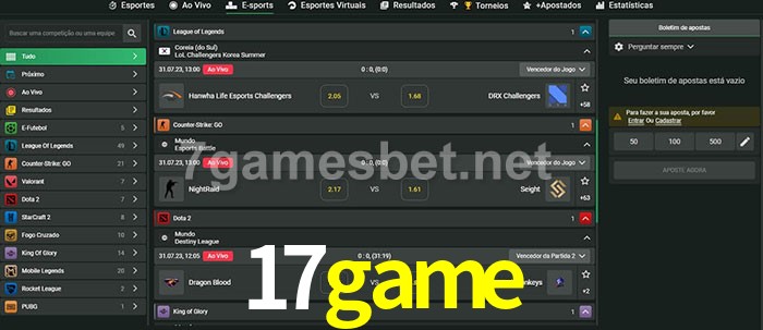 O 17game oferece uma grande seleção de opções de apostas em e-sports com probabilidades competitivas